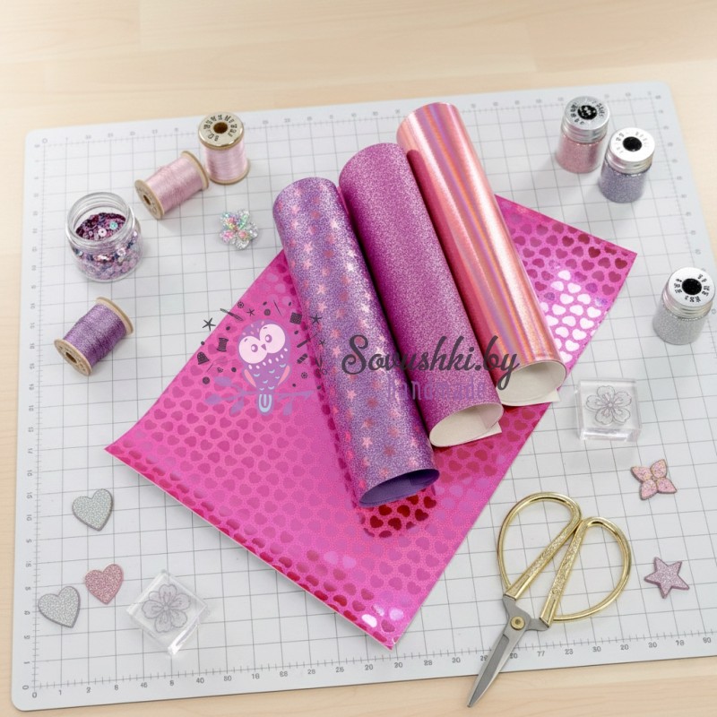 1 лист кожзам голографик "Сердечки" ярко-розовый (21х29,5 см)