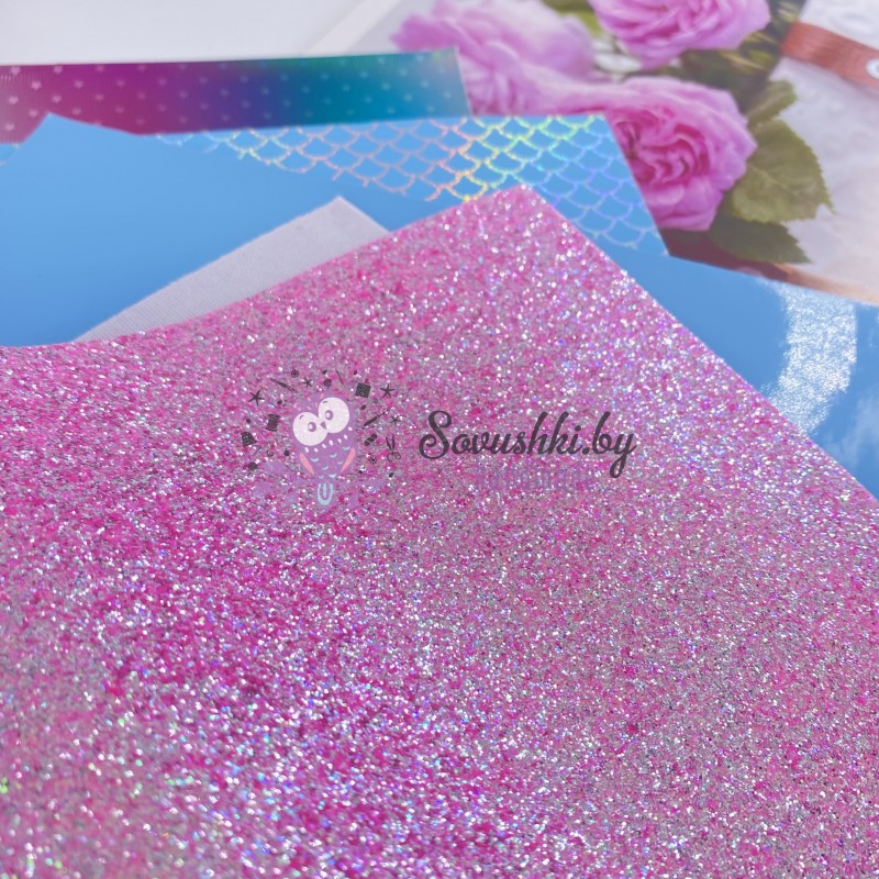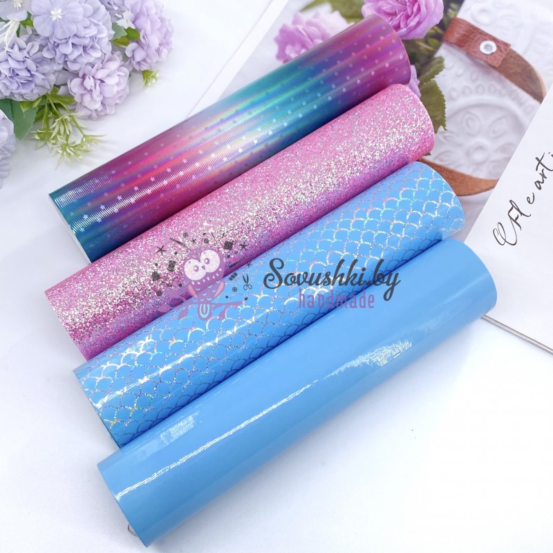 В наборе 5 листа декоративного кожзама:1 лист кожзам с крупными блестками светло-голубой (20х30 см)1..