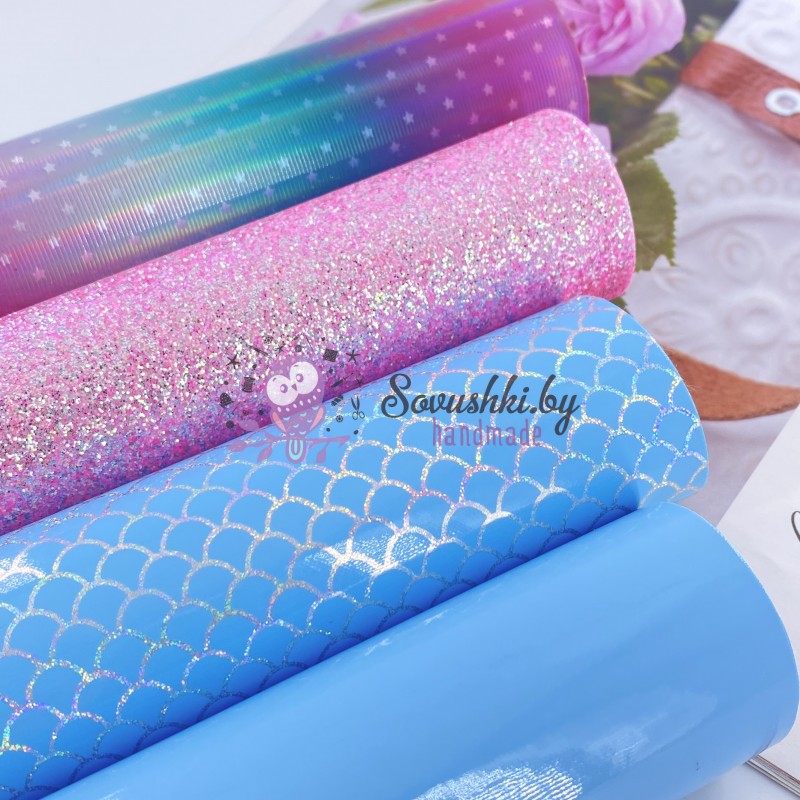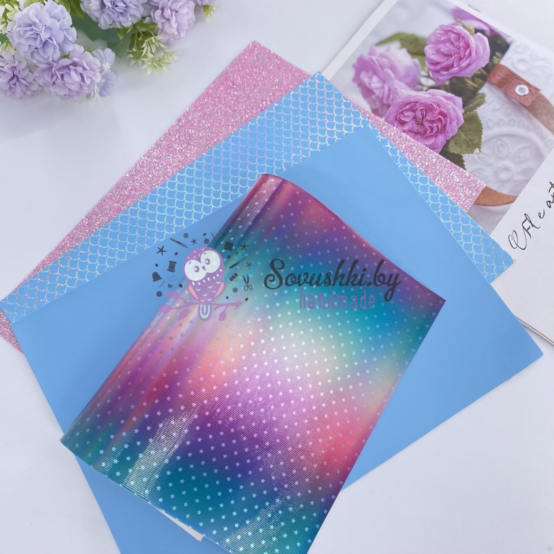 В наборе 5 листов декоративного кожзама:1 лист кожзам голографик "Звездочки" голубой (21х29,5 см)1 л..