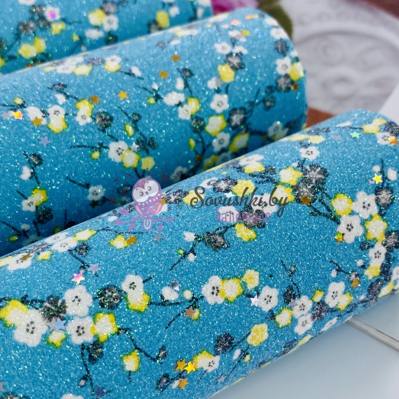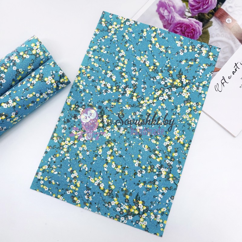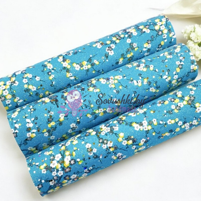 Декоративный кожзам с блестками и рисунком "Цветы", голубой