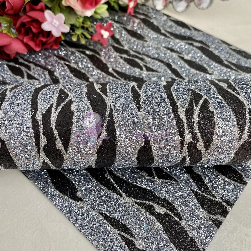 Декоративный кожзам с блестками узор "Волна", черный/серебро