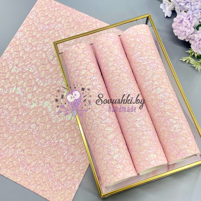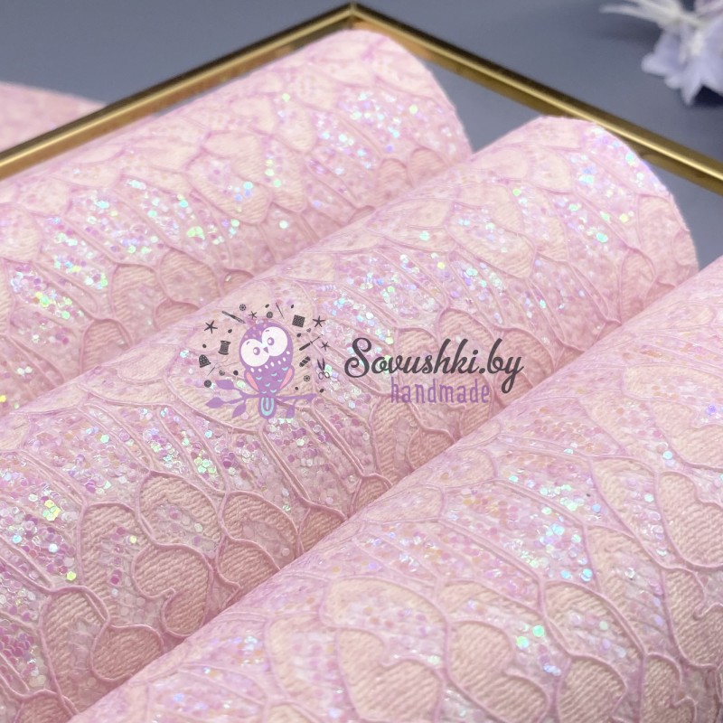 Декоративный кожзам голографик "Звездочки", светло-розовый