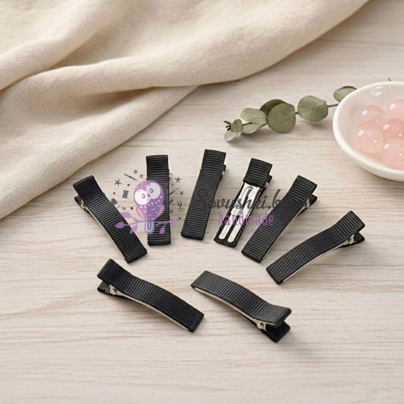 Прочный металлический зажим "крокодил" с мягким тканевым покрытием (репсовой лентой). Длина заколки 3,5 см