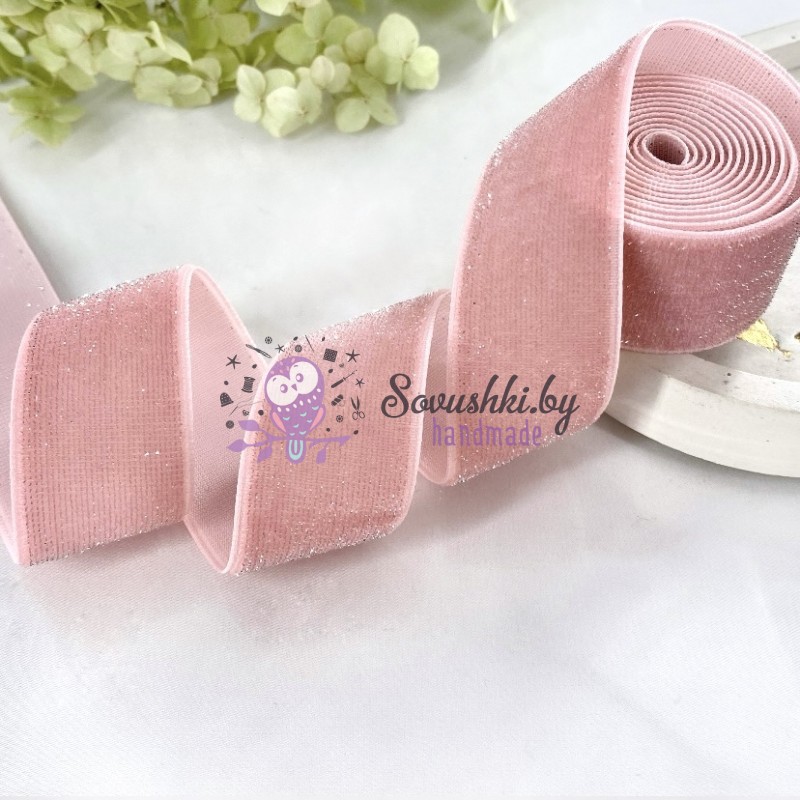 Лента бархатная с люрексом 2,5 см, розовый персик (1.75 м)