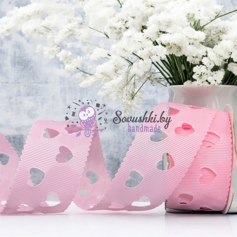 Репсовая лента с перфорацией "Сердечки" (розовый)