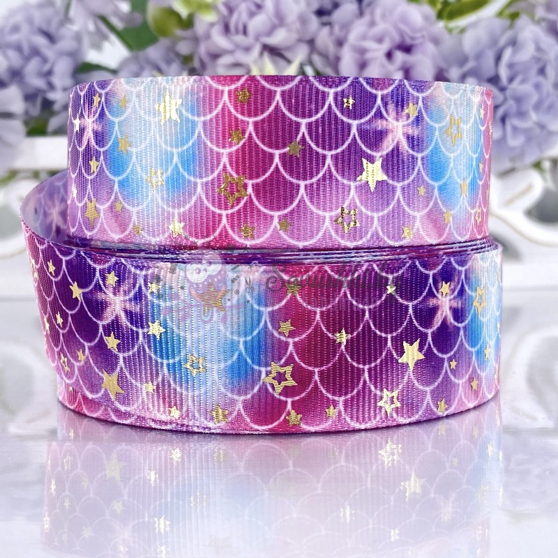 Репсовая лента 2,5 см с фольгированием "Чешуя", фиолетовый/золото