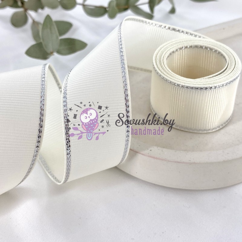 Лента репсовая 2,5 см с люрексом, кремовый/серебро, отрез 1.95 м