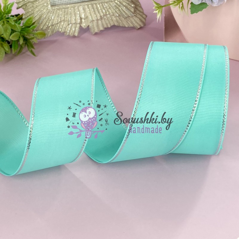 Лента репсовая 4 см с люрексом, светло-аквамариновый/серебро