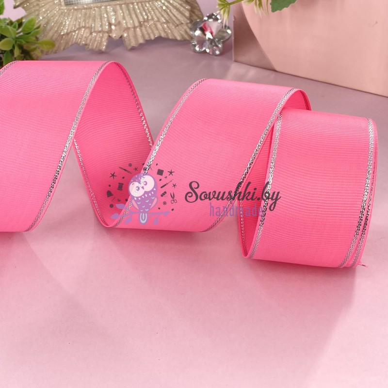 Лента репсовая 4 см с люрексом, ярко-розовый/серебро