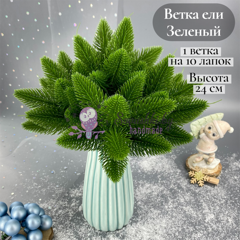 Ветка ели 24 см на 10 хвойных лапок, зеленый