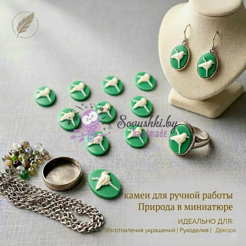Теги: кабошон, кабошоны, камея, кабошон овальный, серединка, кулончик, кулон, камея с птицей, кабошон птичка, зеленая камея, фурнитура для украшений, декор для творчества, кабошоны 16х23 мм, товары для рукоделия, птица на ветке декор, материалы для скрапбукинга, набор камей