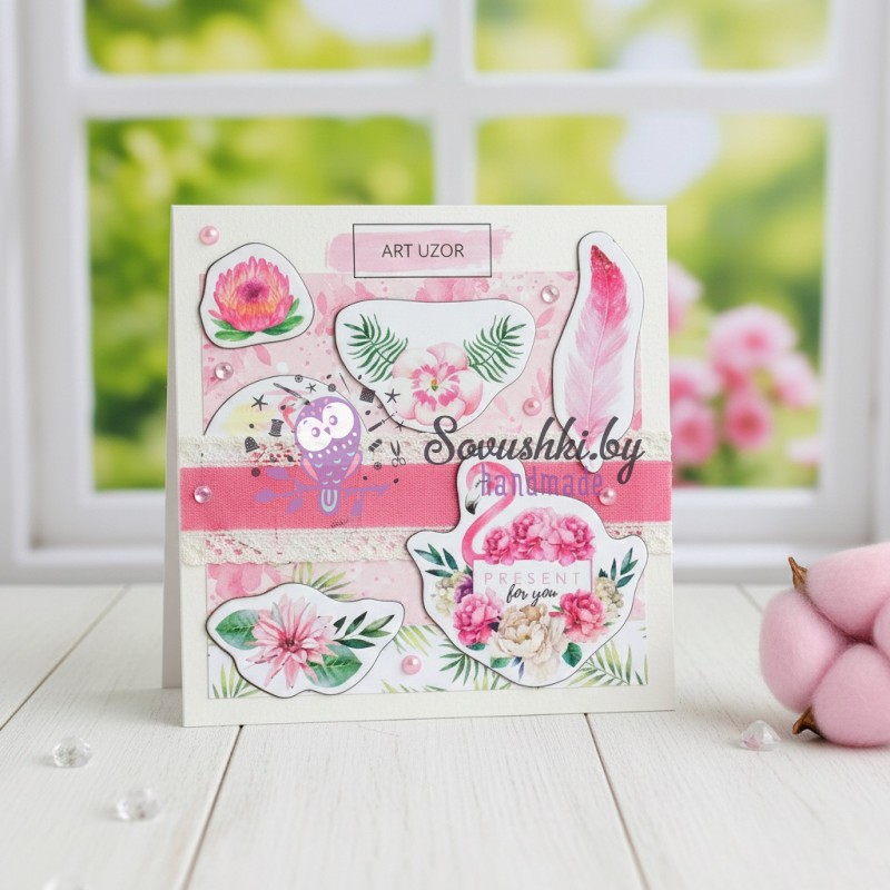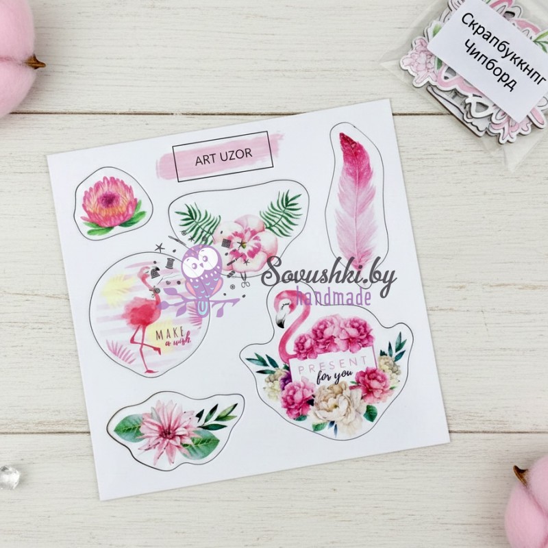 Чипборд для скрапбукинга "Розовый фламинго в цветах"